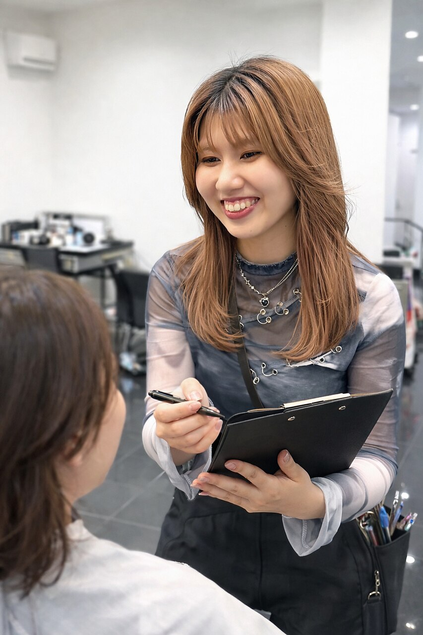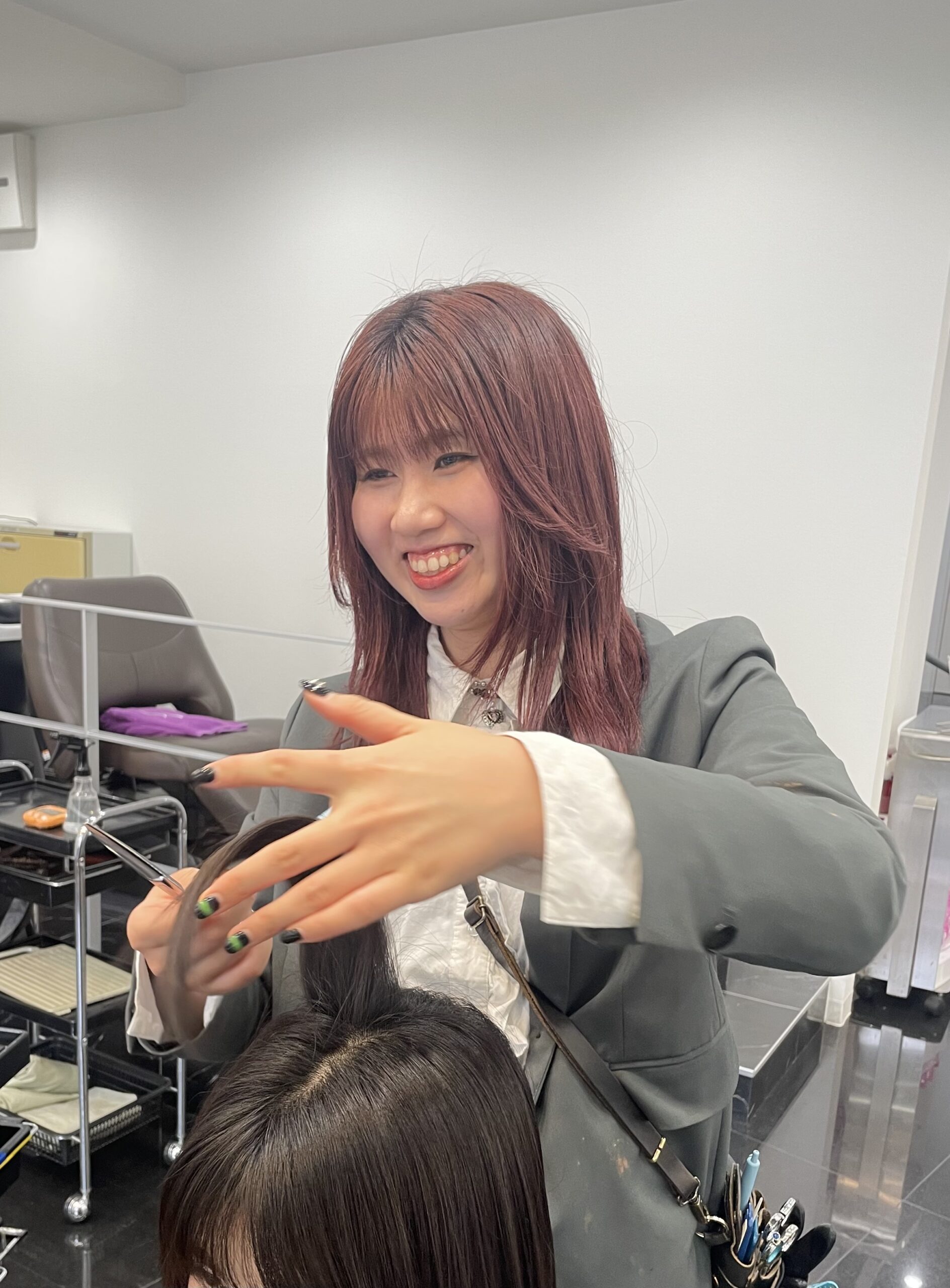 「美容師は自分次第でどこまでも成長できる仕事です。努力した分だけ技術も自信もついて、お客様から直接『ありがとう』をもらえるのが何よりの魅力だと思います。大変な時期もありますが、その先には達成感と楽しさがあります。一緒に美容を楽しみましょう。」