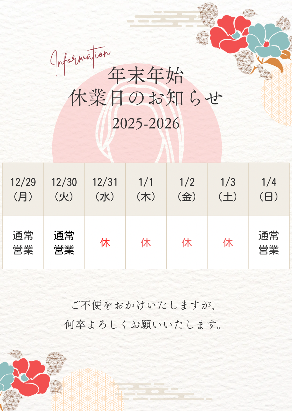 【熊本の美容室|MOB GROUP】年末年始の営業スケジュールのお知らせ 2025.12.17 NEW 平素より、MOB GROUPをご利用いただき誠にありがとうございます。本年も多くのお客様にご来店いただき、心より御礼申し上げます。 年末年始の営業につきまして、下記の通りご案内いたします。 【特別営業日】2025年12月 […]